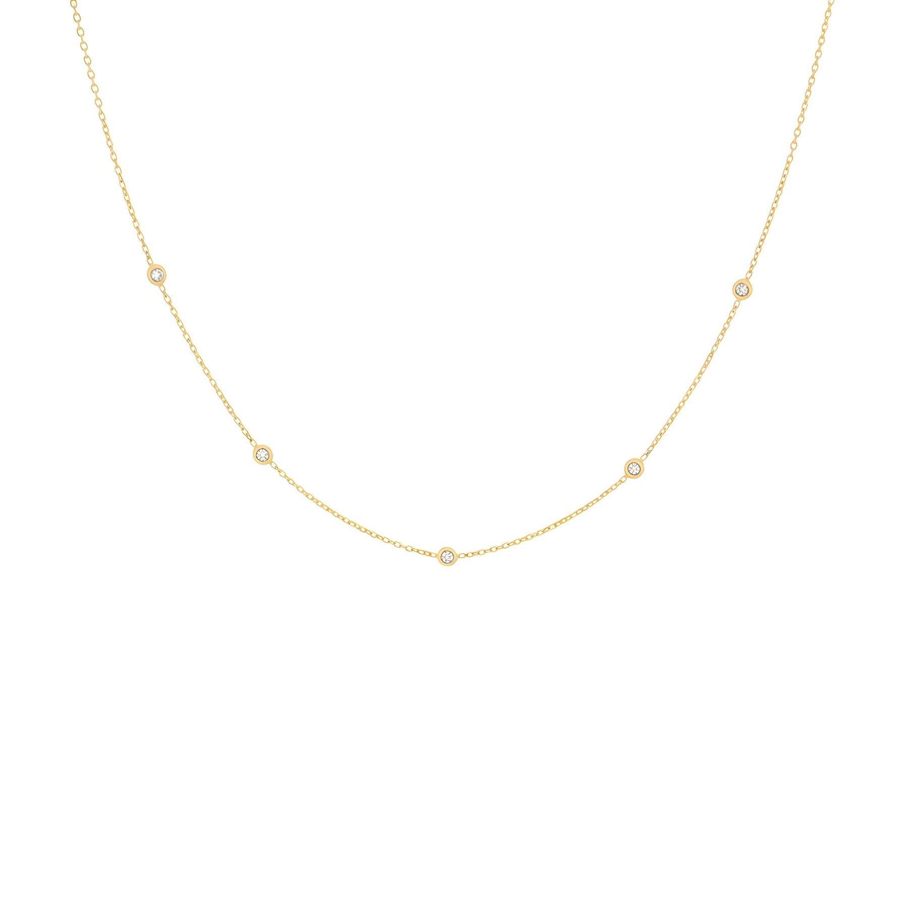 This 14K yellow gold "colori-by-the-yard" necklace features a polished chain adorned with evenly spaced, bezel-set diamonds. Its minimalist design highlights the delicate sparkle of each diamond, creating an elegant and timeless piece.